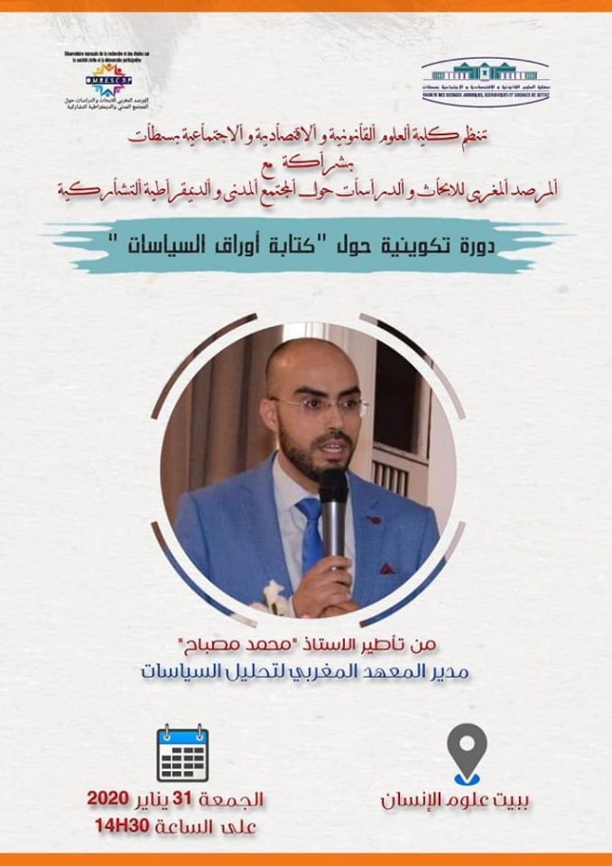 الورشة التي تم تنظيمها من طرف المرصد المغربي للأبحاث و الدراسات حول المجتمع المدني و الديمقراطية التشاركية و كلية العلوم القانونية والاقتصادية و الاجتماعية الحسن الأول-سطات، قام فيها الأستاذ محمد مصباح بالتطرق لمجموعة من التقنيات و المحاور المتعلقة بكتابة اوراق السياسات.