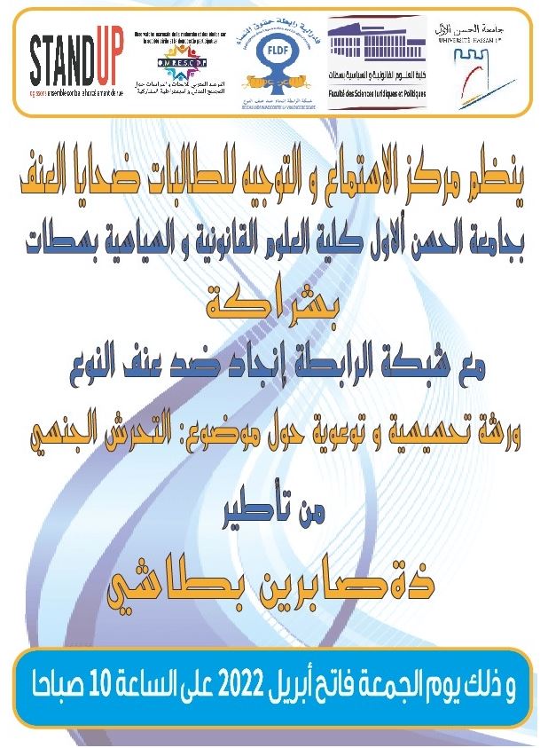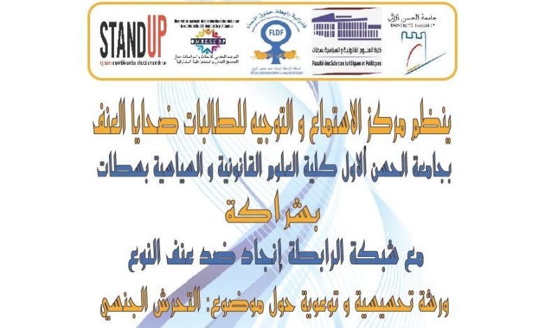 ينظم مركز الاستماع والتوجيه للطالبات ضحايا العنف بجامعة الحسن الأول، كلية العلوم القانونية والسياسية بسطات، بشراكة مع شبكة الرابطة إنجاد ضد عنف النوع، ورشة تحسيسية وتوعوية حول موضوع: “التحرش الجنسي”.
